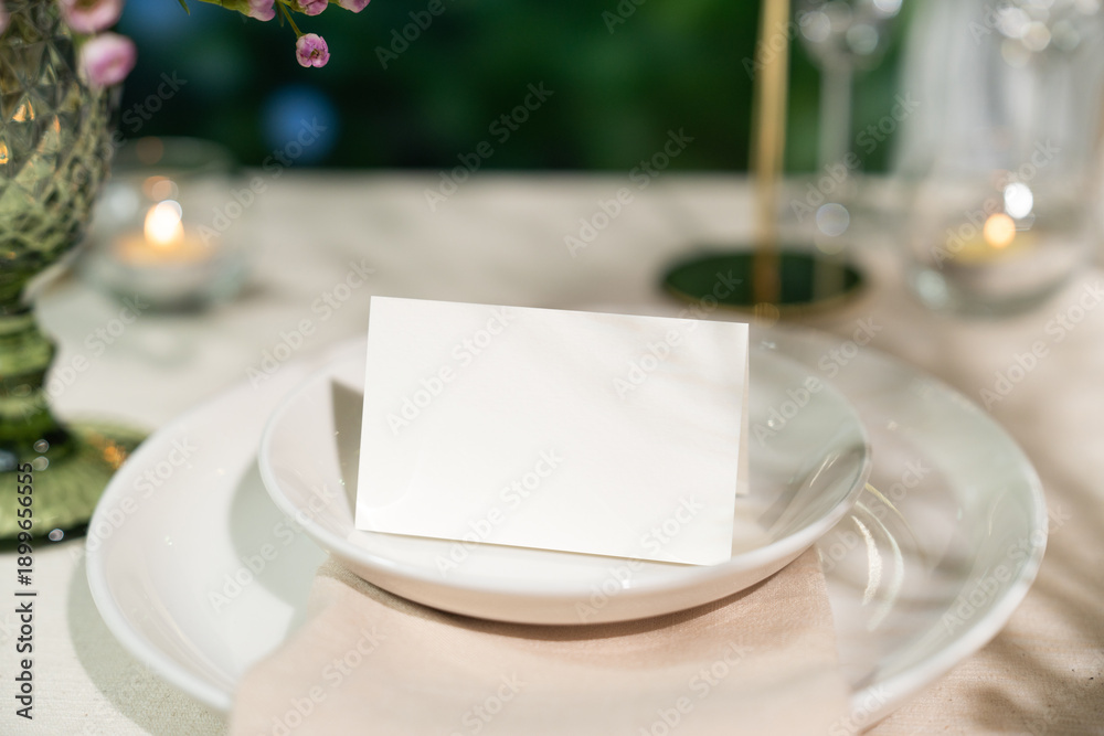 Mockup white blank space card, for Name place, Folded, greeting, invitation on wedding table setting background. with clipping path #1899656555