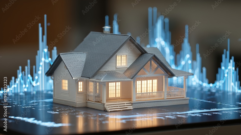 Model house on digital chart representing market analysis real estate with data spike, investment insight and property valuation. #1962132323