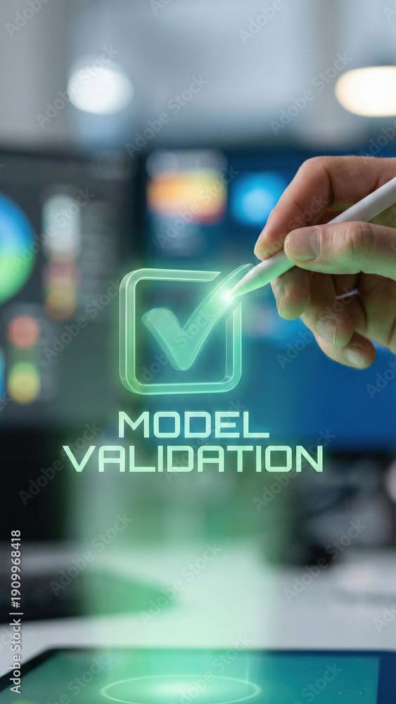 Model validation concept with machine learning visual checklist glowing over tablet screen and stylus office environment showing approval #1909968418