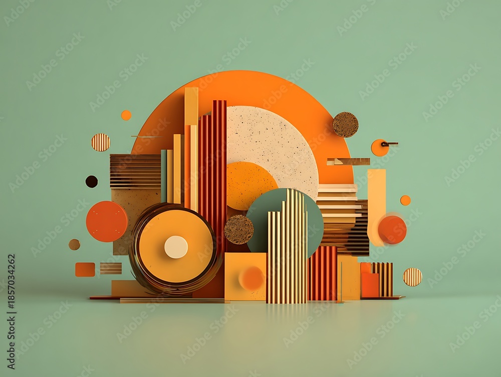 Modern abstract 3D geometric composition with vibrant orange, yellow, and gold shapes. Still life installation with metallic, terrazzo, and matte textures on a pastel sage green background. #1857034262