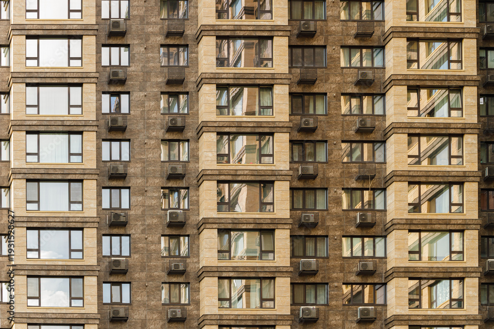 Modern apartment building facade with repeating windows and air conditioning units #1931528627