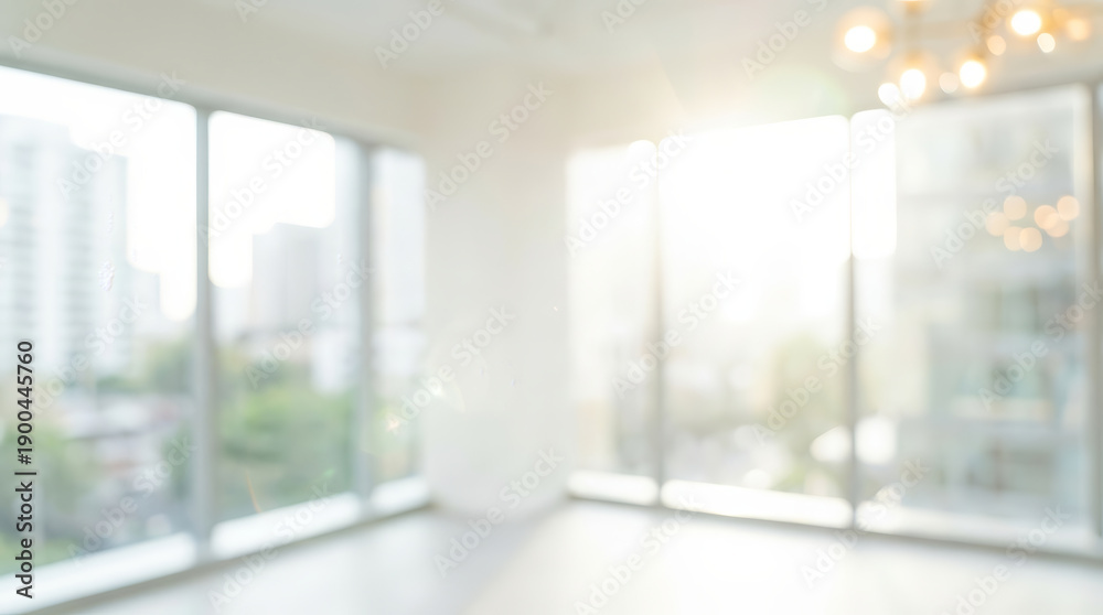 Modern apartment large window city view bright light blurred background empty room glass wall urban building daylight interior design Modern apartment interior with large window city view #1900445760