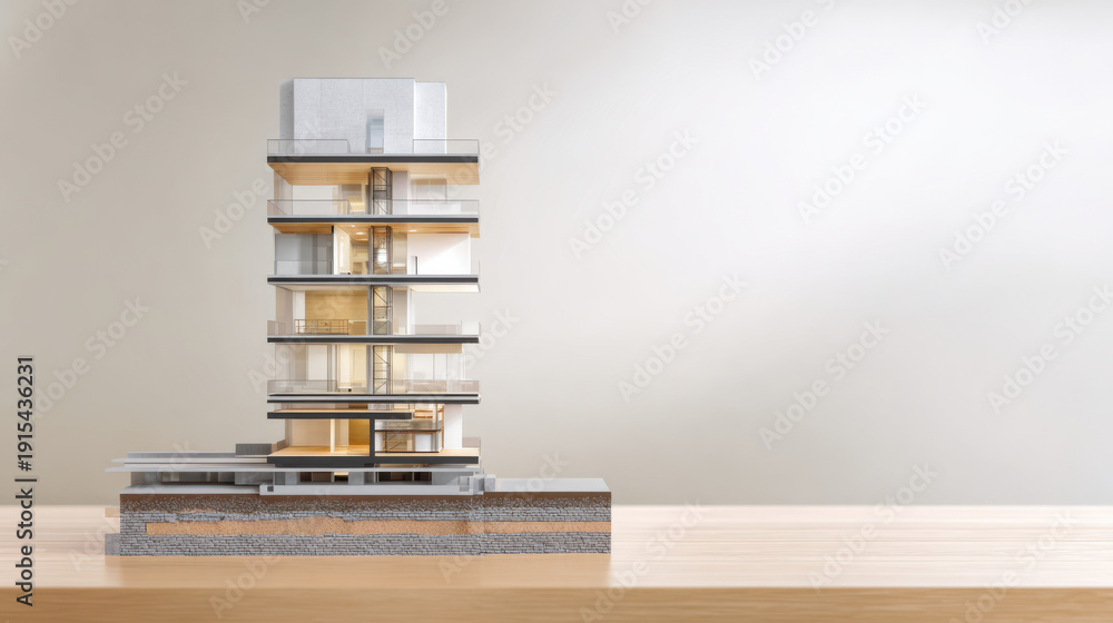 Modern architectural model with cross section showing interior design and structure of high rise building on wooden surface #1915436231