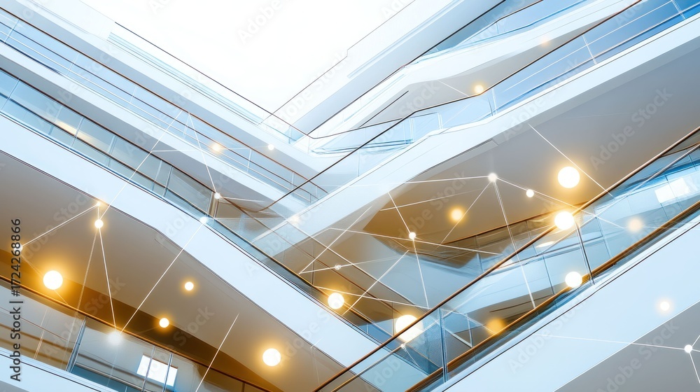 Modern Architecture, Networked Interior Design, Escalators and Glass, Contemporary Building, Futuristic Interior, Illuminated Spaces, Abstract Design #1724268866