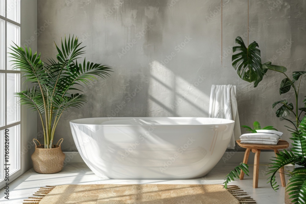 Modern bathroom Scandinavian interior with white tub, table and plants. Empty neutral grey wall for mockup. Promotion background. #1765826970