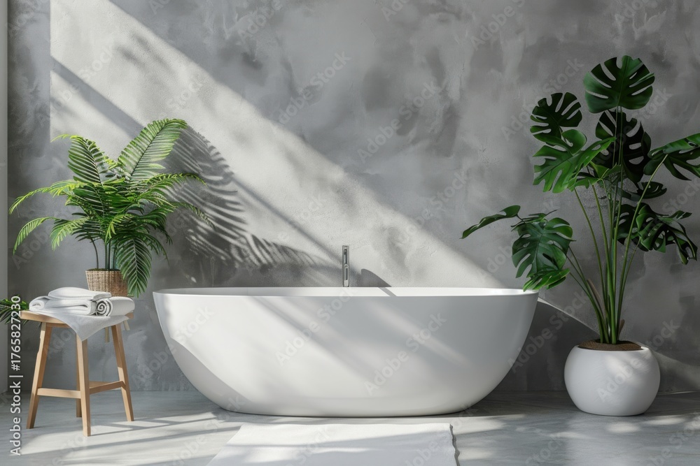 Modern bathroom Scandinavian interior with white tub, table and plants. Empty neutral grey wall for mockup. Promotion background. #1765827230