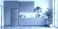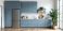 Modern blue-gray kitchen interior with minimalist cabinets, stainless steel fridge, wooden floor, and green plant decoration. Scandinavian home design with clean lines and copy space #1247445979