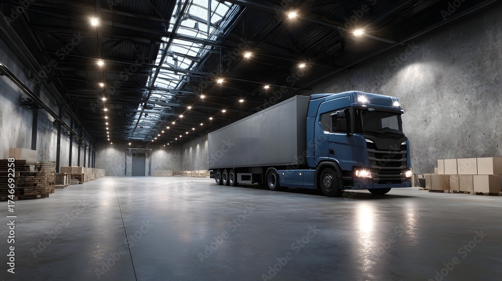 Modern blue semi trailer truck parked inside a vast brightly lit industrial warehouse awaiting cargo ope ns #1746692258