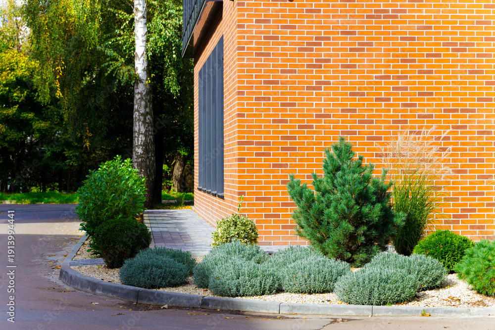 Modern brick building with manicured landscaping and lush green trees in autumn #1913994441