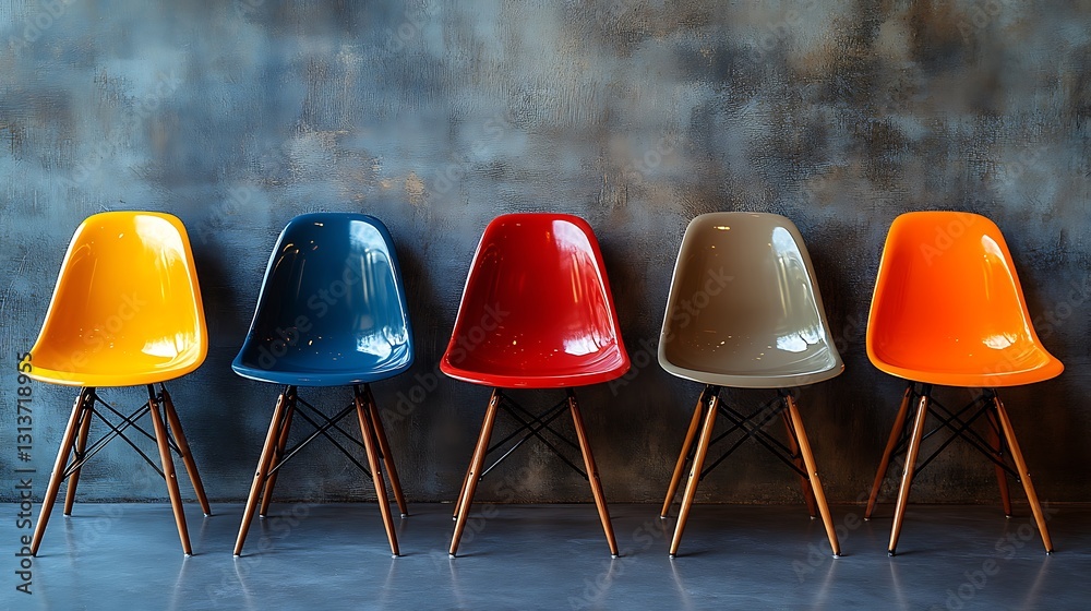 Modern chairs in bold colors and unique finishes lined up against a clean wall with text space #1313718955