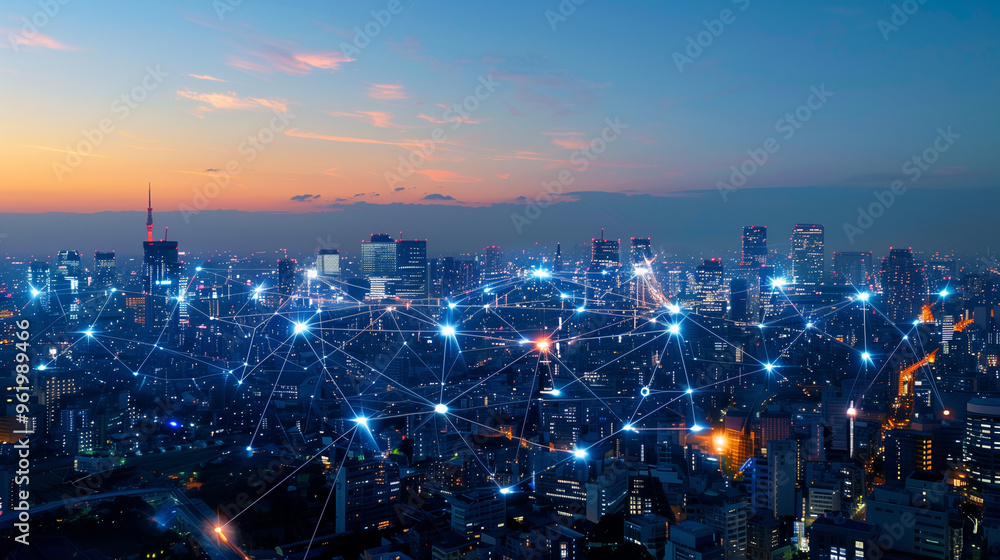 Modern city aerial view and communication network concept. Smart city. Wireless telecommunication #961989466