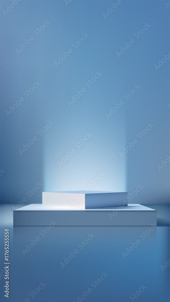 modern 3d podium display with blue and white platform for product showcase mockup exhibition reflective surface vertical light elegant minimalist stage clean studio background design #1765255558