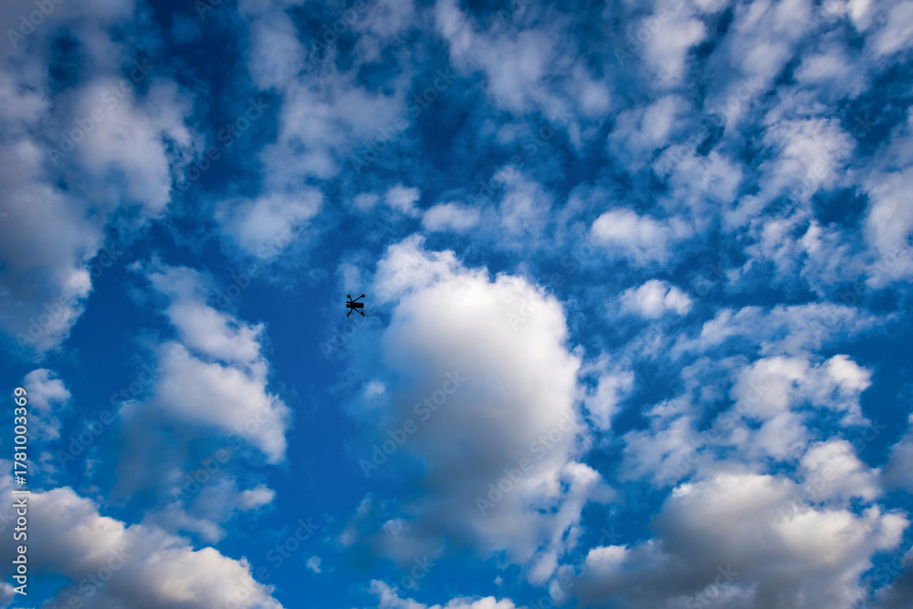 Modern Drone with camera flying over Mt. Fuji with green tea field at sunrise in Shizuoka, Japan. #1781003369