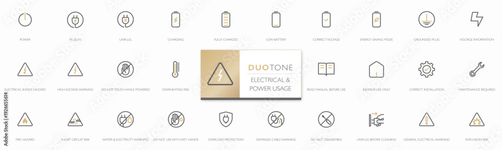 Modern electrical and power usage icon set with minimalist duotone line style. Includes instruction and warning symbols for appliances, batteries, voltage, safety. Editable stroke. Vector Illustration #1926655614