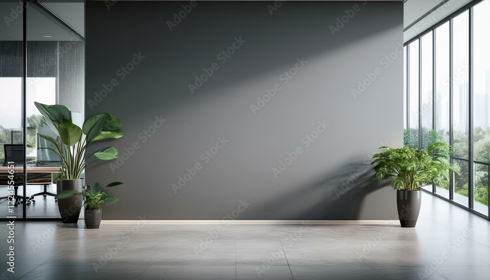 Modern empty grey wall in a spacious office interior with plants and large windows. 3D Rendering #1224554651