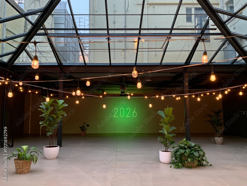 Modern event space with string lights, plants, and neon sign for 2026, ideal for celebrations and gatherings #1771892799