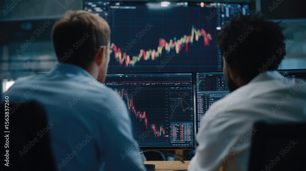 Modern finance expert and investor discussing digital assets, over-shoulder view with real-time chart on screen #1563837260