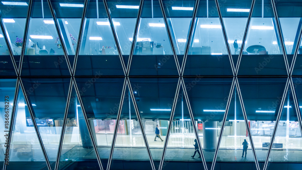 Modern glass office building interior seen through geometric facade in Hong Kong, China. Abstract corporate workplace with anonymous silhouettes symbolizing business activity and organization #1868678273