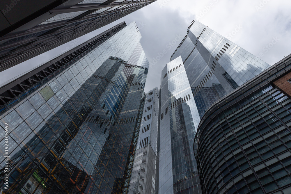 Modern glass skyscrapers reaching towards a cloudy sky #1924015962