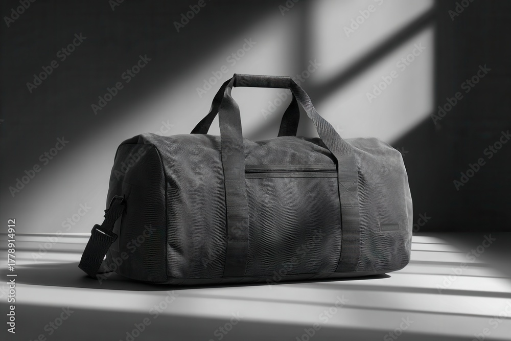 Modern gym bag mockup displayed in a studio setting with soft lighting and shadows cast on the surface #1778914912