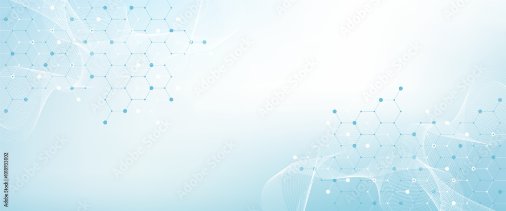 Modern health care or medical background design. Health care innovation concept. Horizontal header web banner. Abstract geometric background with hexagon shapes for medicine, science, chemistry. #1018933002