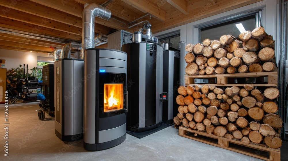 Modern heating system with stove and stacked firewood in a spacious garage setting #1725304306