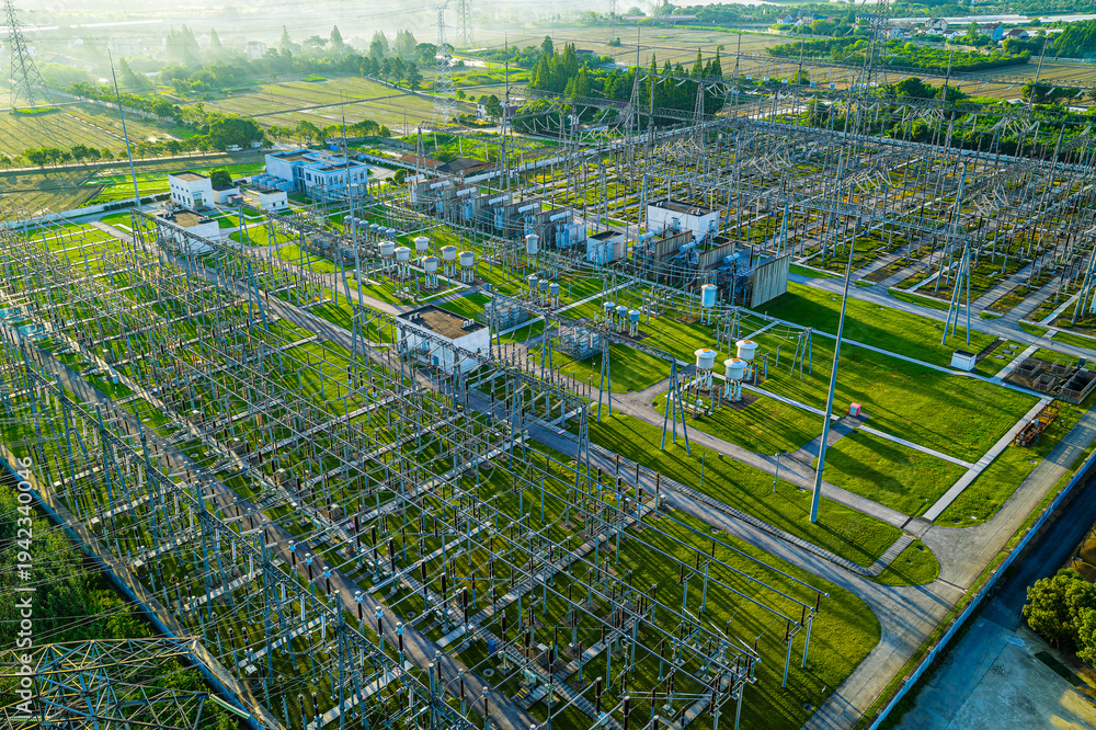 Modern high-voltage electrical substation and power transmission towers for electricity distribution. #1942340046
