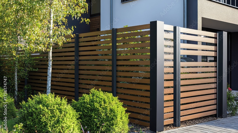 Modern horizontal slatted fence privatizing a residential garden property #1736174747