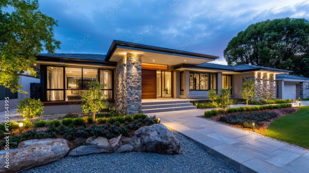 Modern house exterior with stone features and illuminated landscaping at twilight in a suburban neighborhood #1763854995