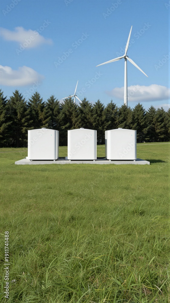 Modern industrial battery storage units and wind turbines generating and storing renewable power for carbon-neutral infrastructure and sustainability. #1911741488