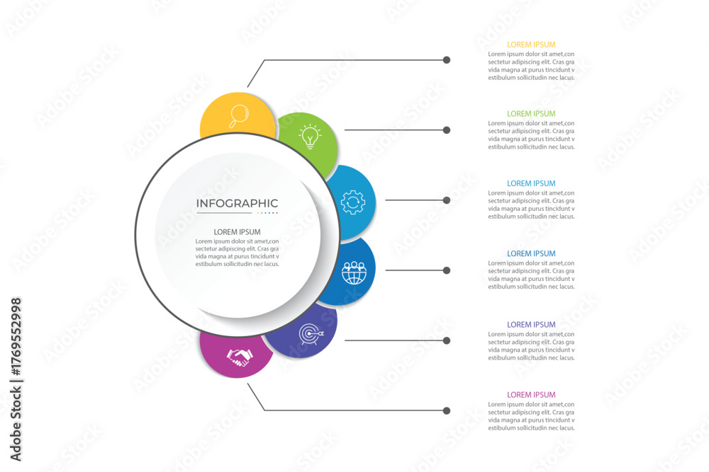 Modern infographic template. Creative circle element design with marketing icons. Business concept with 6 options, steps, sections. #1769552998