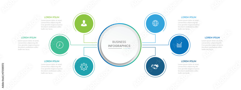Modern infographic template. Creative circle element design with marketing icons. Business concept with 6 options, steps, sections. #573585172
