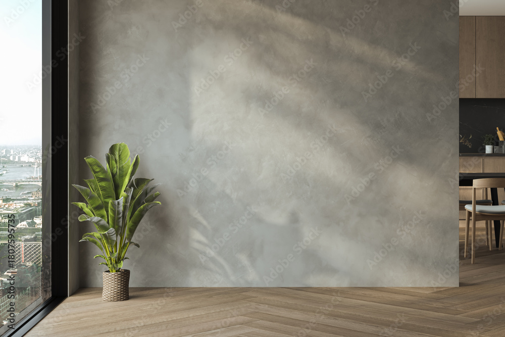 Modern interior design of apartment, kitchen, dining room with table and chairs, empty living room with concrete wall, panorama. 3d Rendering #1807595735