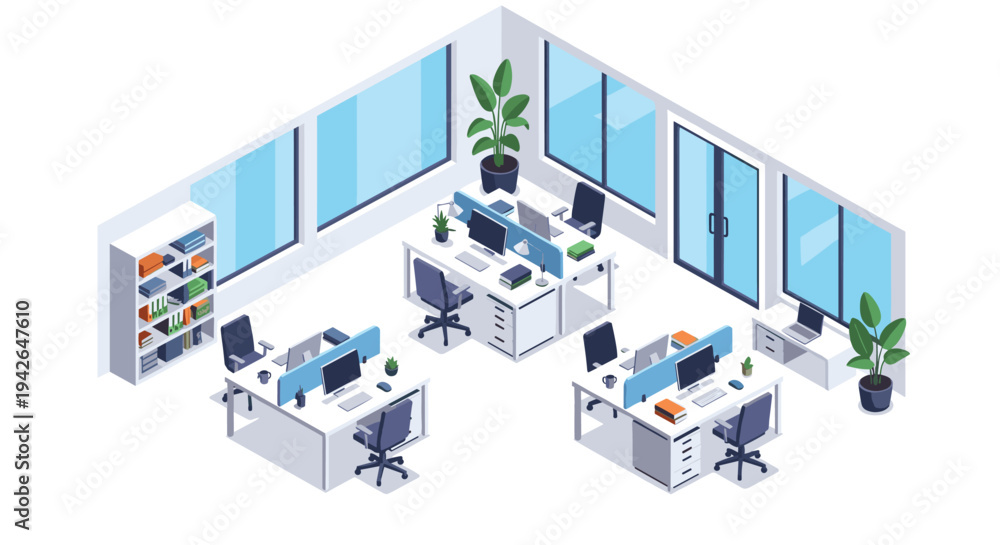 Modern isometric office interior with desk, shelves, and plants in bright workspace #1942647610