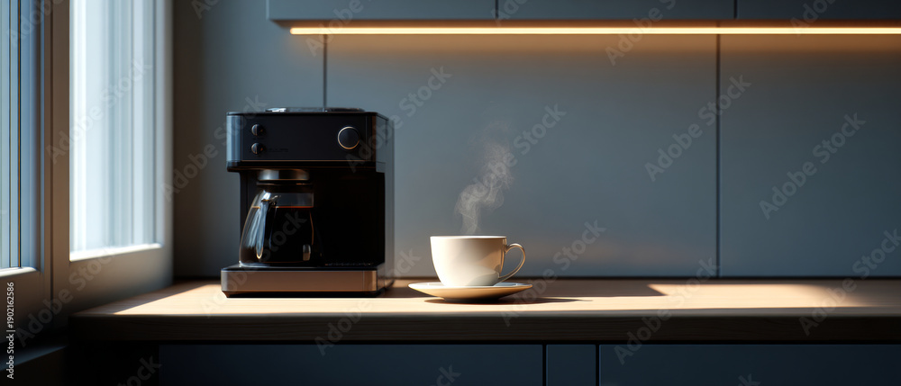 Modern kitchen countertop with black coffee maker and steaming white cup of coffee in natural morning light #1902162586