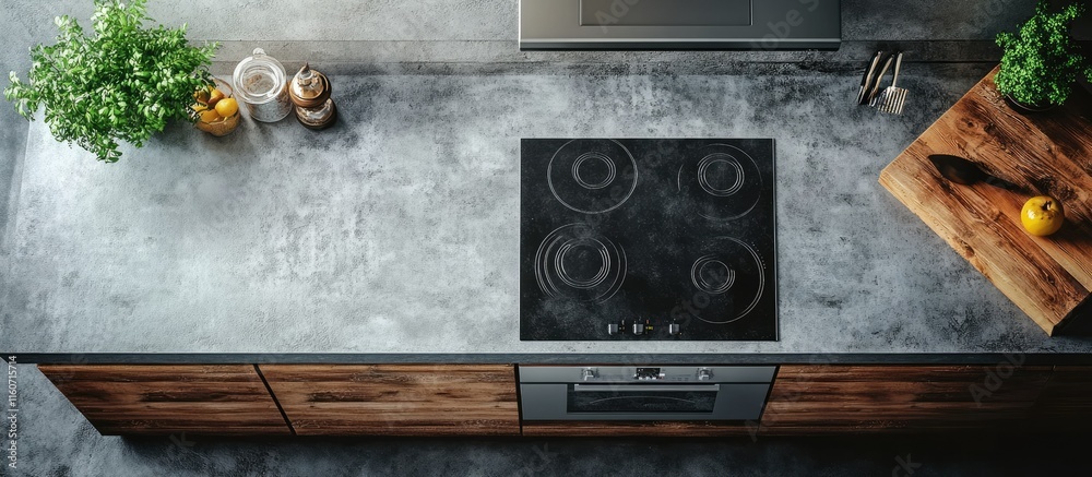 Modern Kitchen Design: Top-Down View of Sleek Induction Cooktop and Rustic Wood Cabinets #1160715714