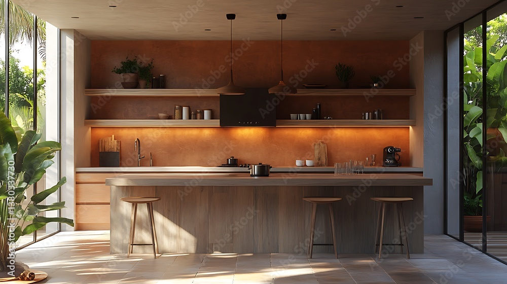 Modern kitchen in warm tones, earthy terracotta tile backsplash, raw wood island, dim ambient lighting, and handcrafted decor pieces on open shelving. Created Using: indoor mood lighting technique, #1380337730