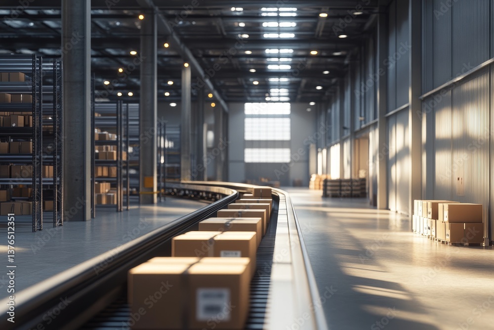 Modern logistics warehouse interior with conveyor belt and moving cardboard boxes. #1376512351