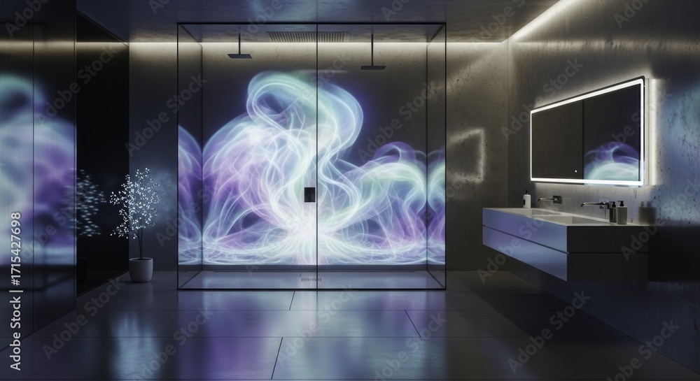 Modern Luxury Bathroom with Futuristic Glass Shower featuring Abstract Light Art, Sleek Floating Vanity, and Illuminated Mirror in a Contemporary Interior #1715427698