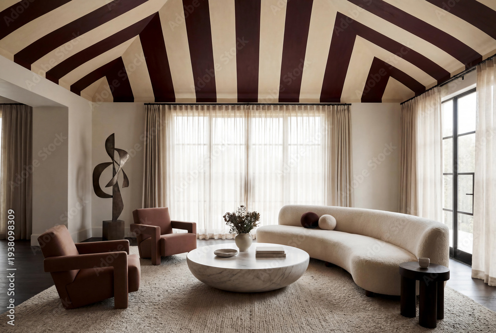 Modern luxury living room interior with striped ceiling in circus style featuring curved white sofa and designer armchair in minimalist funhaus aesthetic #1938098309