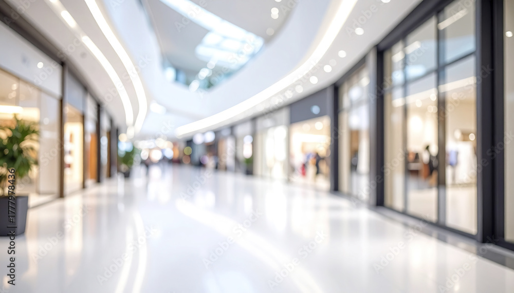 Modern mall hallway with soft lighting and blurred storefront shapes creating spacious and bright shopping environment with clean white floor and curved ceiling design #1777978436