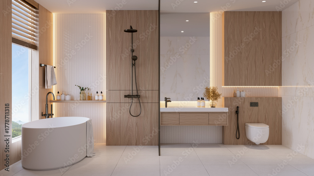 Modern minimalist bathroom interior with wooden wall panels, white freestanding bathtub, and large window. Bright natural light creates a warm and cozy atmosphere.3drender #1778711318