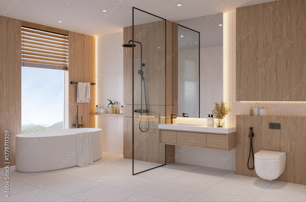 Modern minimalist bathroom interior with wooden wall panels, white freestanding bathtub, and large window. Bright natural light creates a warm and cozy atmosphere.3drender #1778711359