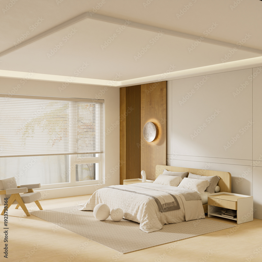 Modern minimalist bedroom highlighting negative space with a wooden bed and slatted wall panels featuring a stylish armchair and soft lighting in a bright contemporary room. 3D illustration #1923738368
