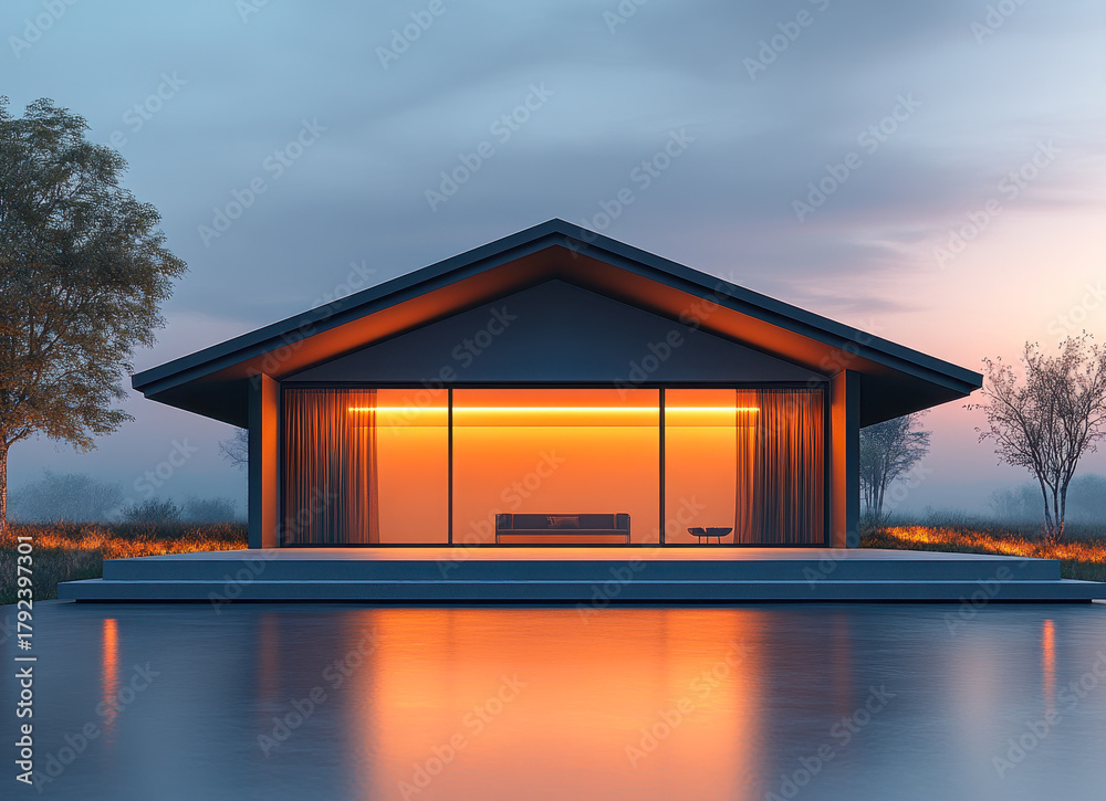 Modern minimalist house with glowing orange interior at sunset near calm reflective water #1792397301