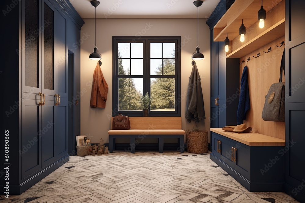 Modern mudroom interior, entrance hall in house, home storage space. Generative AI #610890663