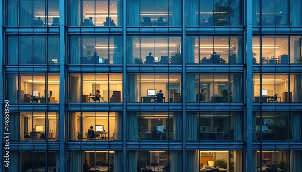Modern office building facade at night. Illuminated windows show people working late inside cubicles. Business center exterior sleek glass architecture. Employees work diligently, computers glow. #1763513750