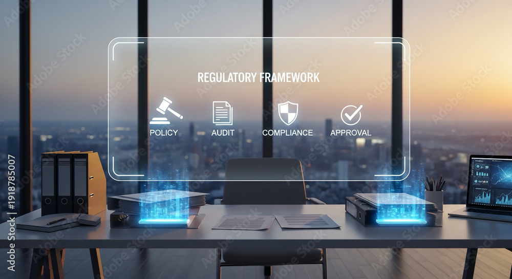 Modern office workspace with regulatory framework interface displaying policy audit compliance and approval icons at sunrise #1918785007