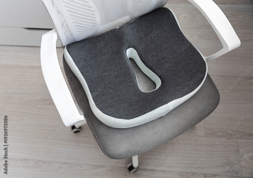 Modern orthopedic seating cushion in grey color with ergonomic design rests on white mesh office chair, promoting comfort and proper posture for sitting indoors. #1936973386