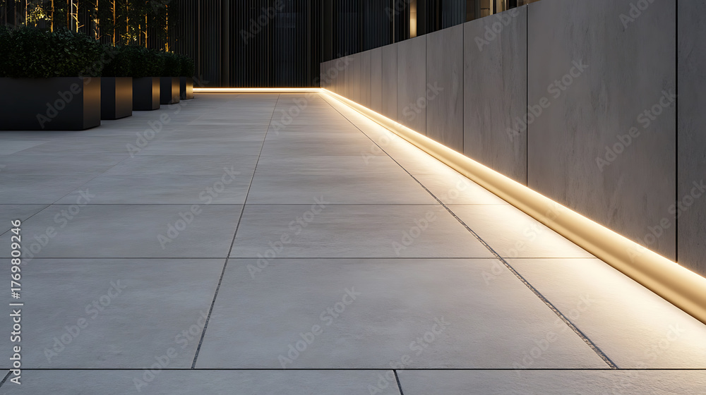 Modern outdoor space featuring sleek gray tiles and warm, linear lighting. Potted greenery adds a touch of nature. A simple yet stylish aesthetic. #1769809246